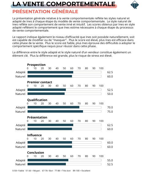 Le rapport Talent Insights version Commercial vous permet d’identifier les motivations de chaque commercial fait le lien avec les 76étape du cycle de vente (de la prospection à la conclusion) en pointant les forces naturelles et les zones de vigilance. Un commercial brillant en prospection mais moins à l'aise dans la phase de premier contact le verra noir sur blanc, avec des pistes d'amélioration concrètes. Le manager, lui, sait où accompagner et où laisser faire.